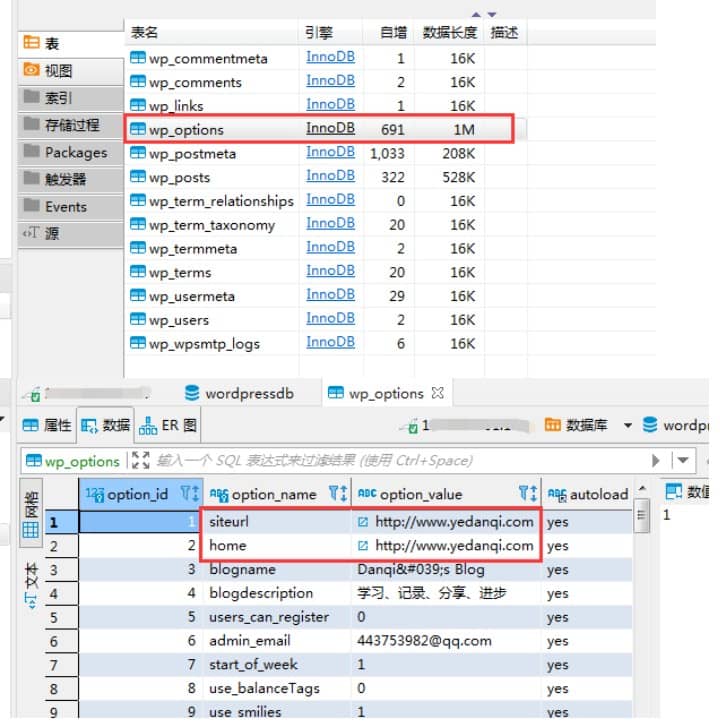 注意上面的标点要都要用英文半角。其中 wp_options 就是表名,option_value 就是表 wp_options 里的一个字段,wp_options 里有 siteurl 和 home 的值。