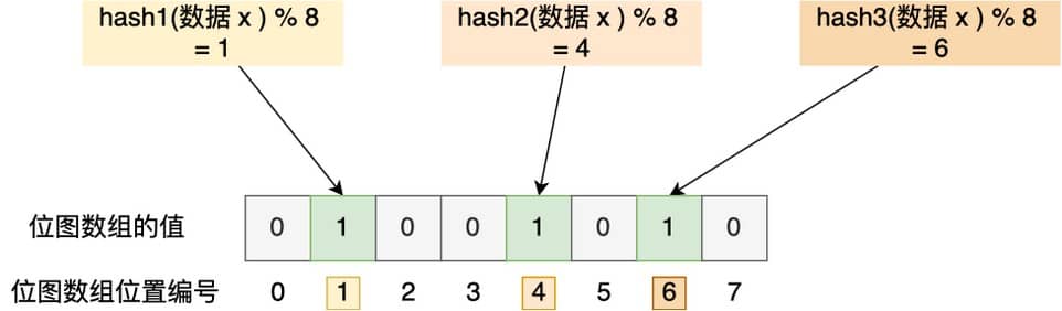 在数据库写入数据 x 后,把数据 x 标记在布隆过滤器时,数据 x 会被 3 个哈希函数分别计算出 3 个哈希值,然后在对这 3 个哈希值对 8 取模,假设取模的结果为 1、4、6,然后把位图数组的第 1、4、6 位置的值设置为 1。当应用要查询数据 x 是否数据库时,通过布隆过滤器只要查到位图数组的第 1、4、6 位置的值是否全为 1,只要有一个为 0,就认为数据 x 不在数据库中。