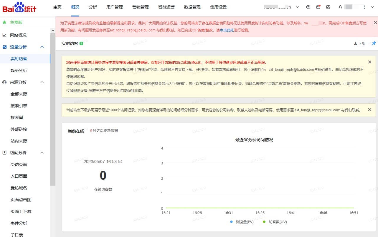 最近突然发现我的未备案的网站,在百度统计实时访客页面不给正常显示数据了,提示要求备案方可提供正常服务。