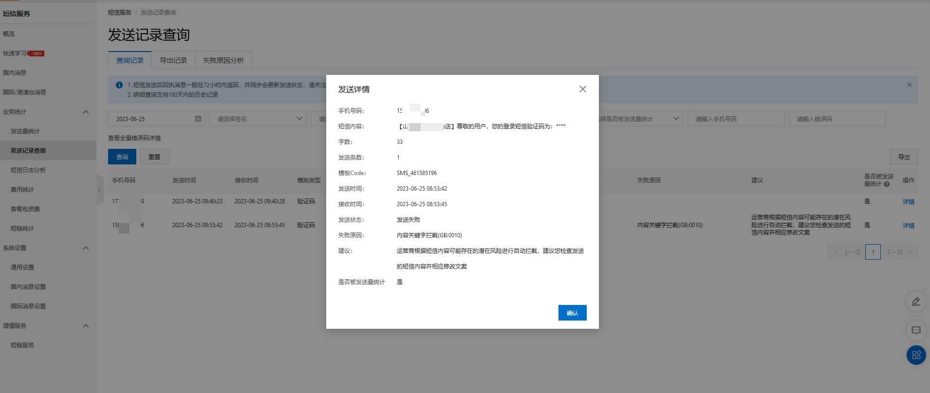 登录阿里云的短信服务管理后台查看,发现许多的短信验证码被电信运营商拦截。