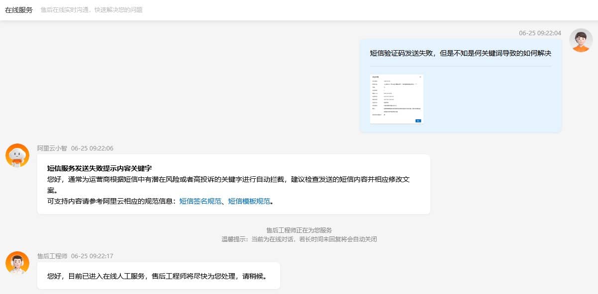 阿里云短信服务,验证码发送失败。