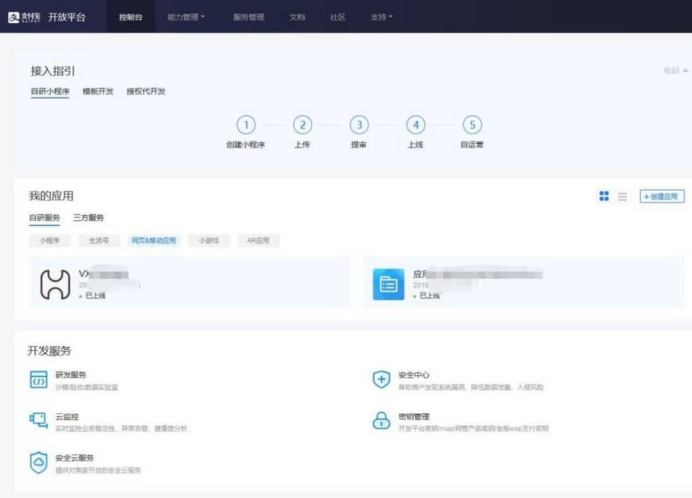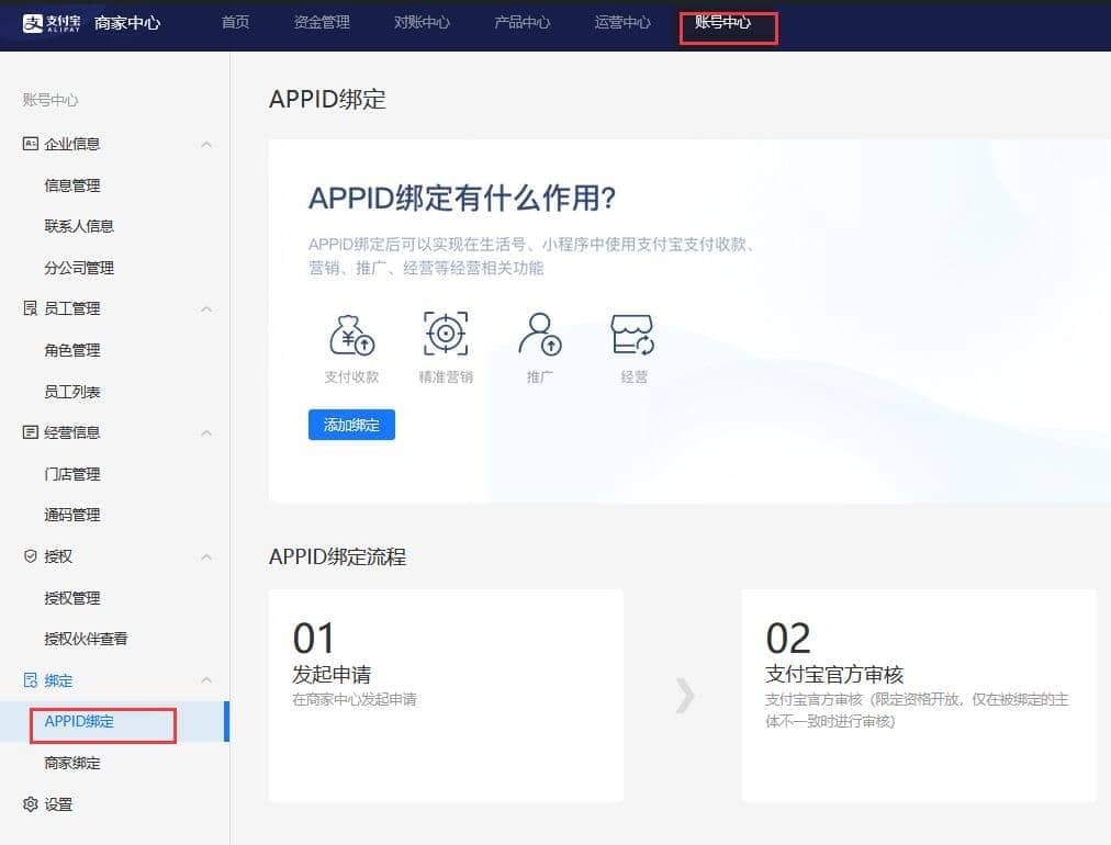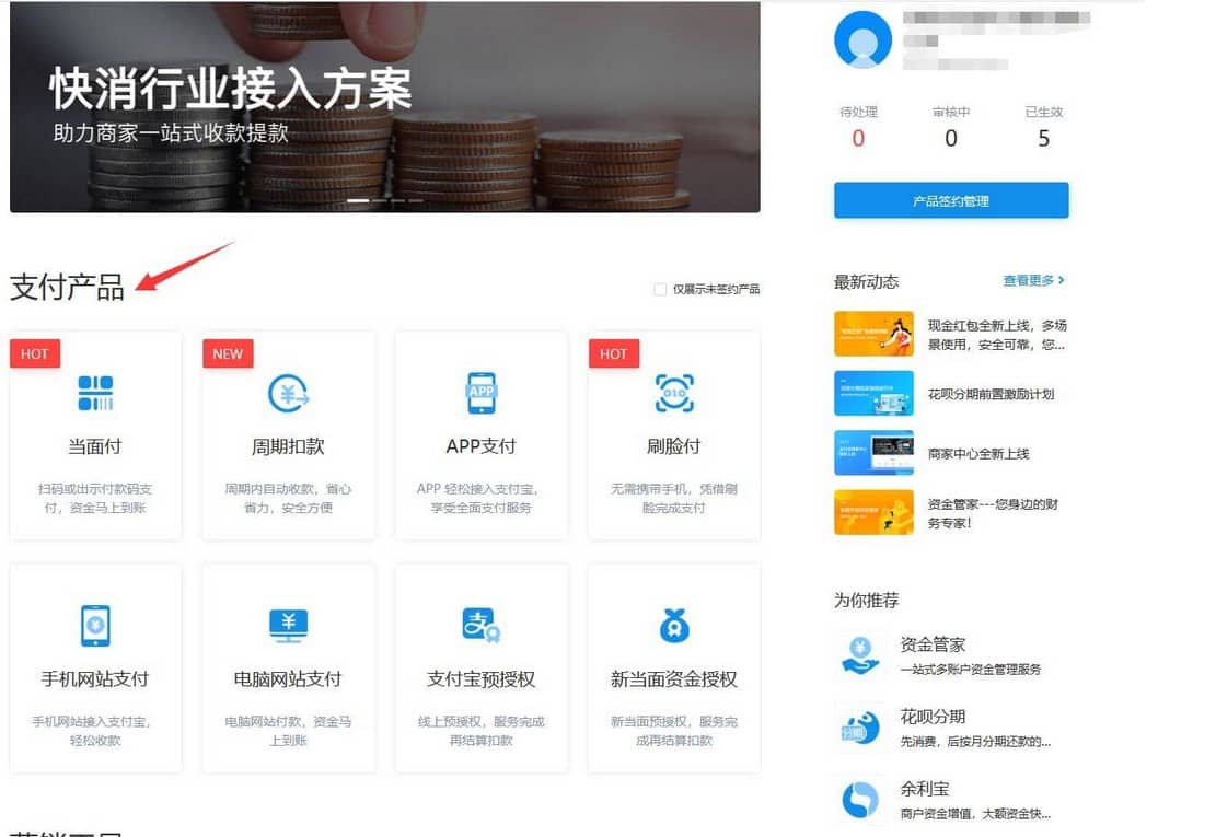 1 在商家中心 https://b.alipay.com 申请签约相关产品