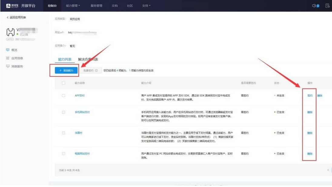 4 在开放平台相关应用中为该应用“添加能力”,并签约