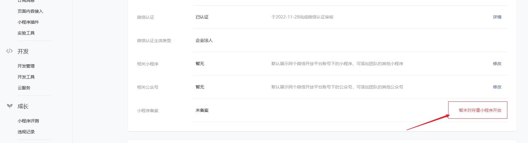 提示“暂未对存量小程序开放”,就是说对于已上架的小程序,暂时还没法申请小程序备案。