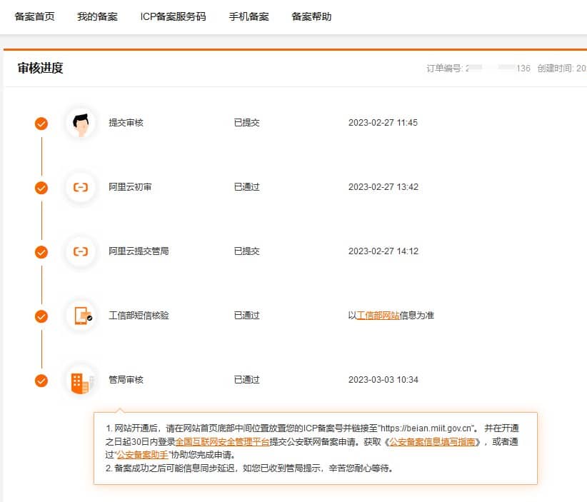 至此以上四个步骤,可以在 1 个工作日内完成。如果用户填写和上传的材料没有问题,阿里云初审通过后就会把你的备案订单提交至管局,你收到短信核验码后,在工信部进行短信核验,整个过程 1 天即可搞定。