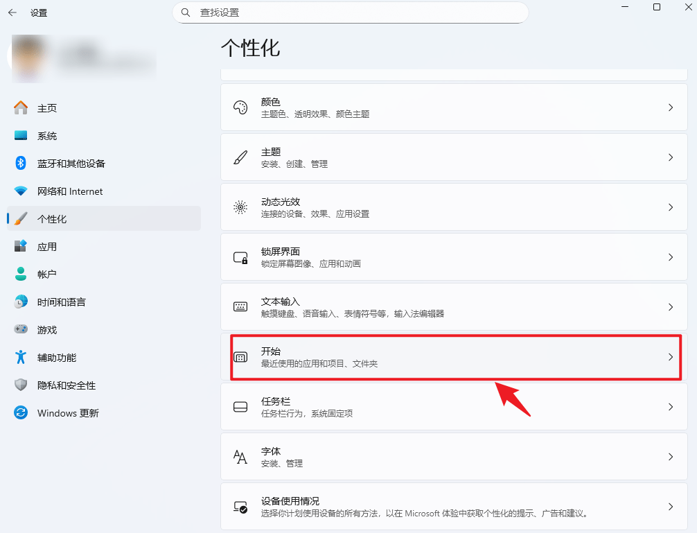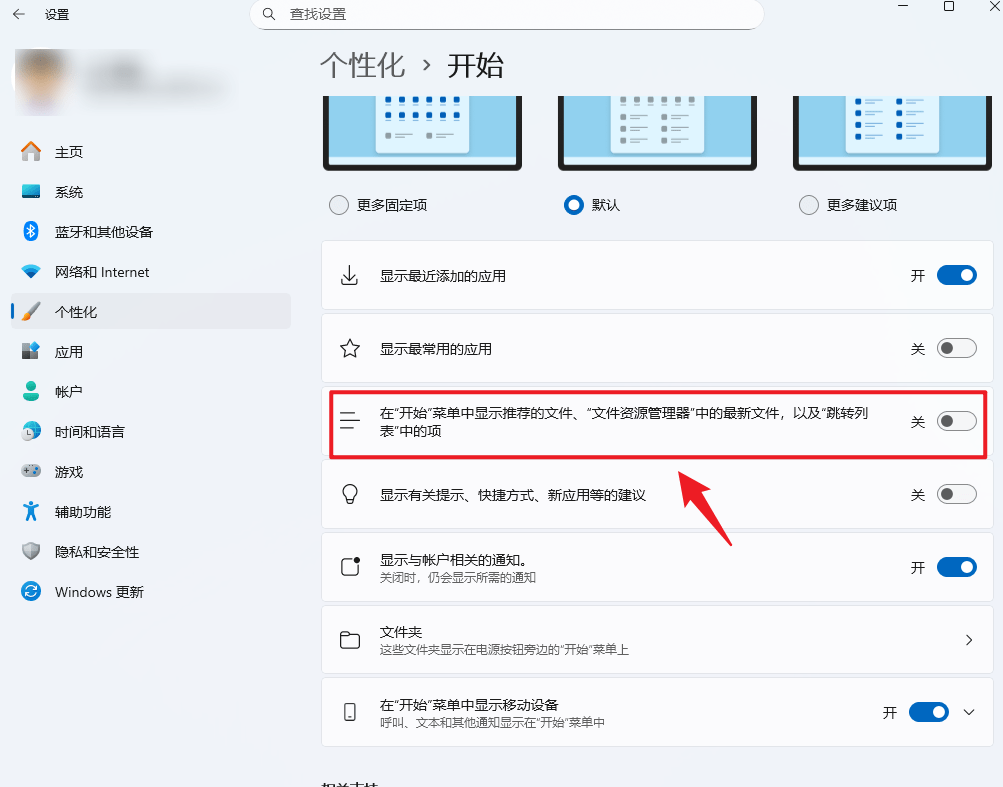 2、打开“设置”-“个性化”-“开始”- 关闭“ 在开始、跳转列表和文件资源管理器中显示最近打开的项目 ”